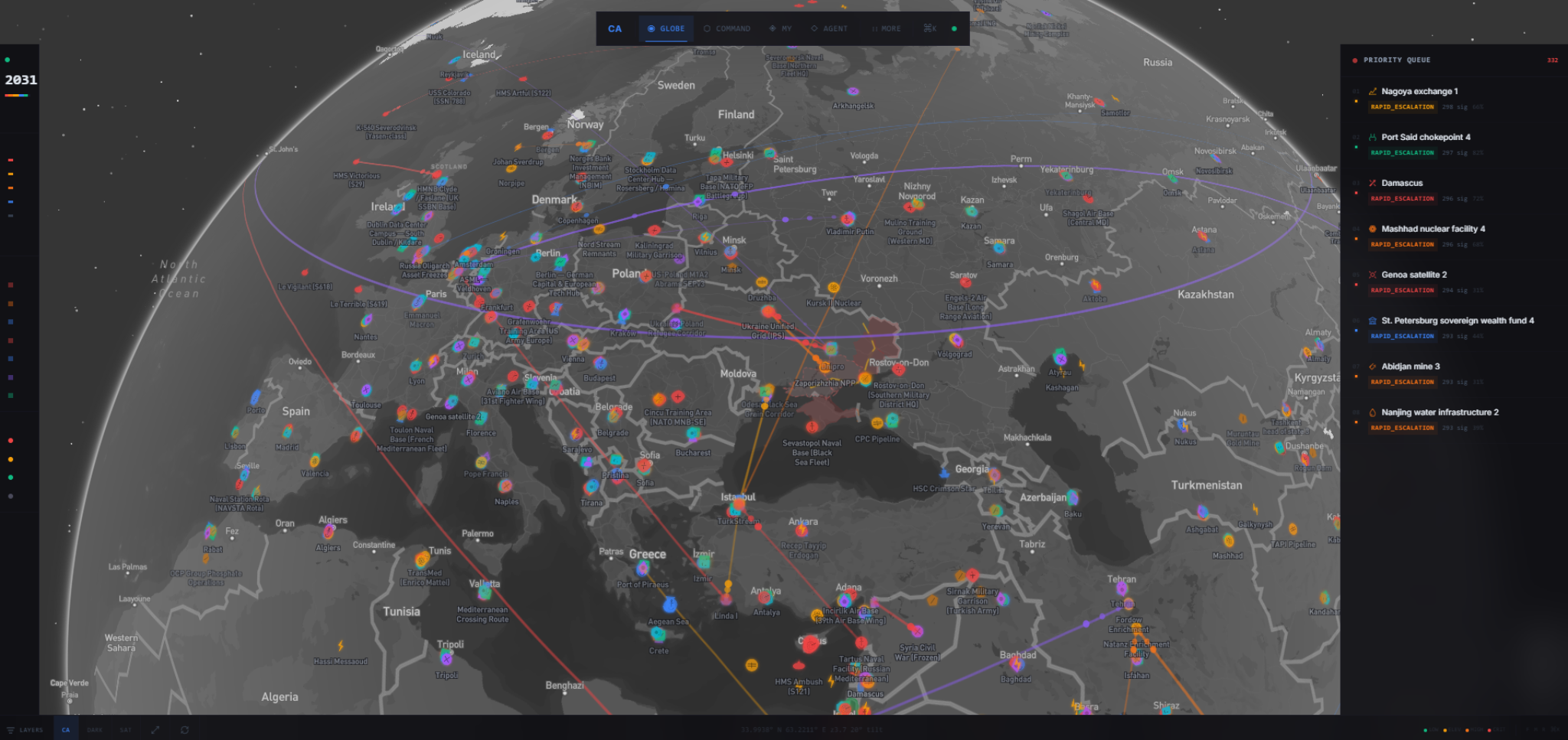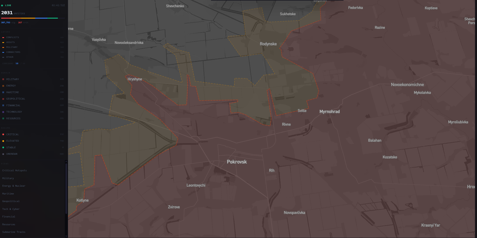 Filter by domain. Preset views for critical hotspots, nuclear watch, conflict zones, dark fleet tracking.